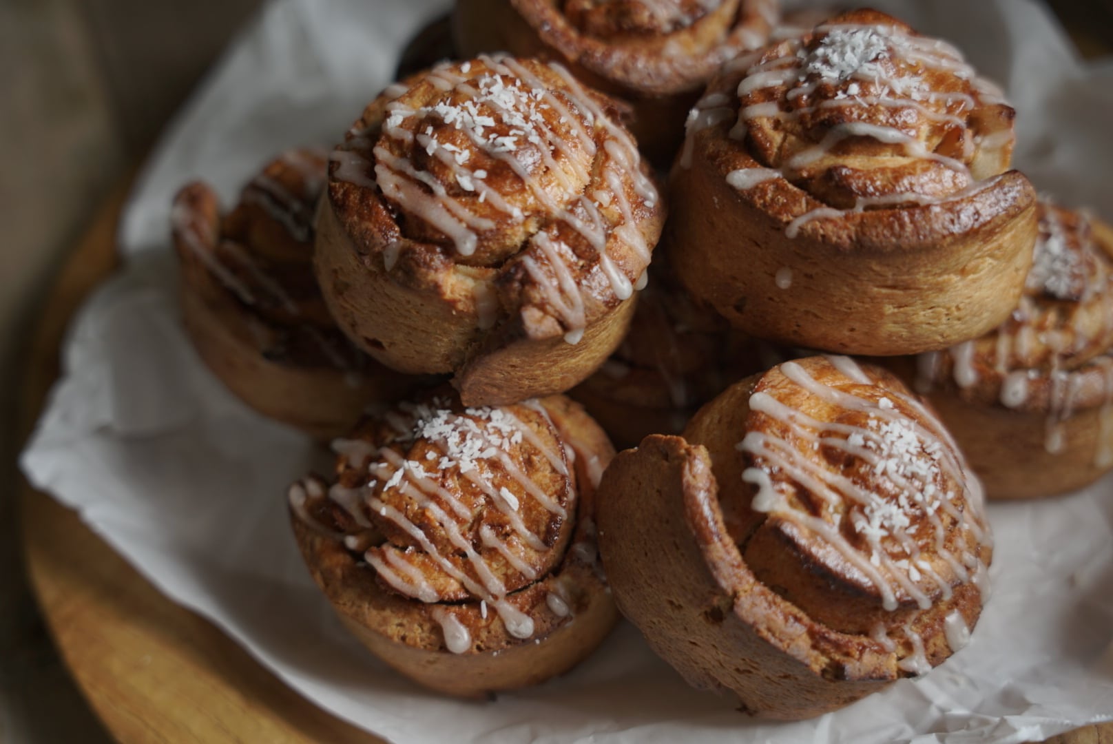 シナモンシュガー、レーズン、クルミをくるりと巻いて焼き上げました。