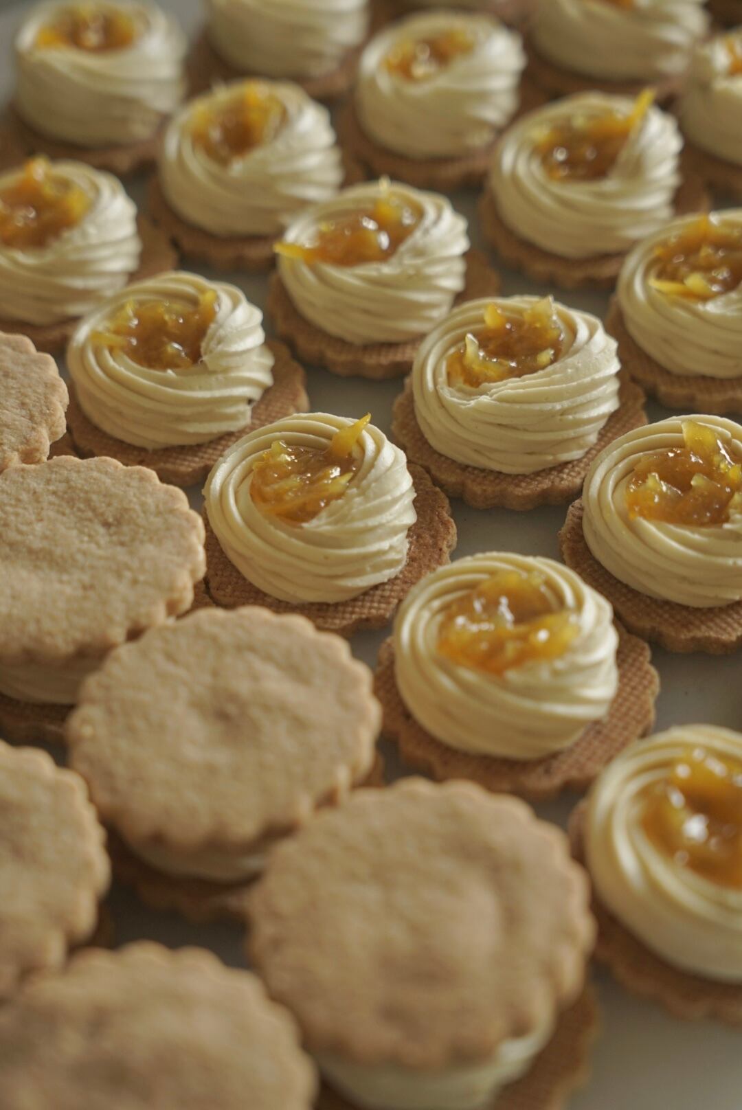 サクサクと焼き上げたショートブレッド生地で、ミルキーでなめらかなヴィーガンバタークリームをふんわりと絞り、その中央に、柚子の果実感あふれるコンフィチュールを重ねてサンドしました。